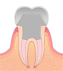 エナメル質、象牙質を貫通し、歯髄(歯の中にある神経や血管)まで到達した虫歯です。急性症状がある場合は、鼓動に連動したような痛み(拍動痛)が現れ、特に夜になると眠れないほどの痛みが出ることがあります。すぐに根管治療が必要です。